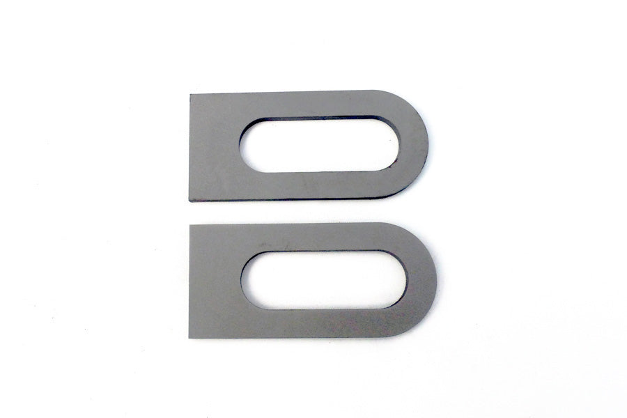 Spacers for Chop Source axle plate style B. These 3/16" spacers increase the axle plate width to 9/16". They must be welded to the axle plates. Allows for the use of stock chain adjusters on motorcycles that have wider axle plates.
