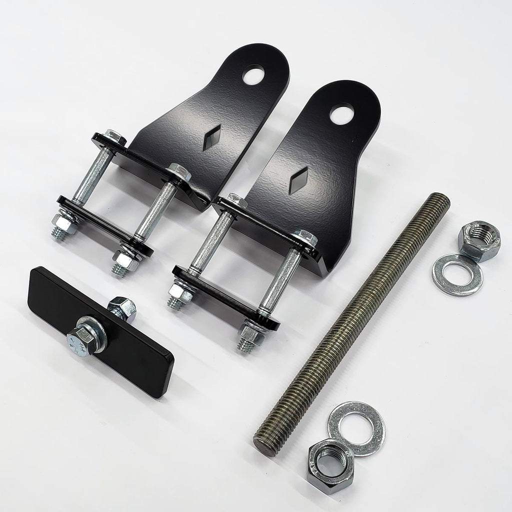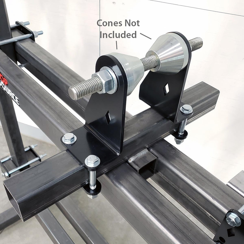 The Bottom Bracket Fixture is used to support the bottom bracket shell of your bicycle frame. It comes with the plates and hardware shown in the first picture and works with 2"x2" tubing only (customer-supplied). Bottom Bracket Cones are sold separately. The 7/16" bolt holes (in the 90-degree brackets) are slotted 3/16" of an inch to allow for fine adjustments if the tubing they mount to it isn't welded perfectly perpendicular to the lower rails of the frame jig.