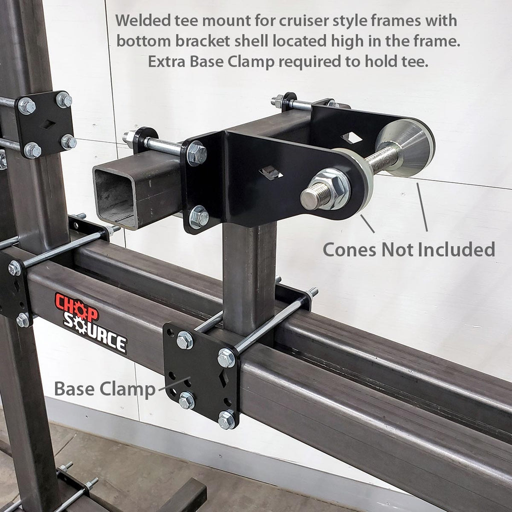 For cruiser bicycle frames with the bottom bracket high in the frame, you may want to create a Tee from 2"x2" tubing (as shown in the last picture) and mount the fixture brackets to the top of the tee facing the rear dropouts. This will require an additional Base Clamp to support the welded Tee. You can also make a welded "L" from 2"x2" tubing and clamp it to the outside of one frame rail of the jig (with a spacer) like the upright for the seat tube fixture. The fixture brackets can then be mounted to the horizontal part of the "L".