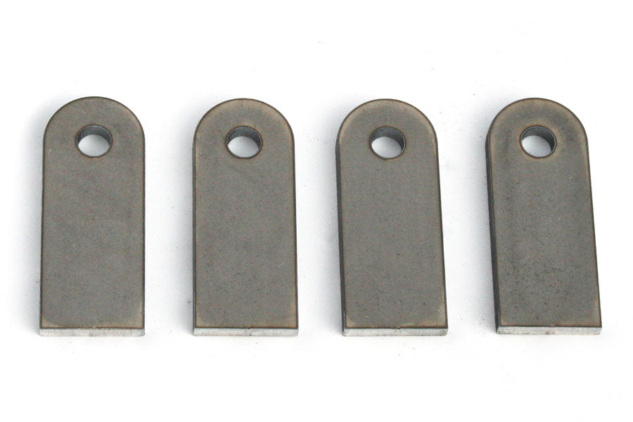 Weld-on mounting tabs. Style E. Perfect for your chopper / bobber / cafe motorcycle frame for mounting electrical boxes, tanks, signals, coils, etc. For certain applications they can also be used for things like shock mounts and engine mounts.