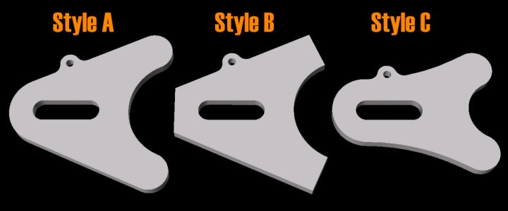 The axle plates come in three styles: A, B, and C, and all are available with 17mm, 20mm, 3/4", or 1" / 25mm slots. See Axle Plates